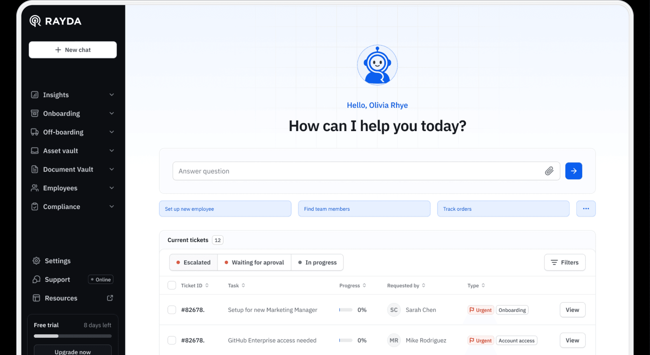 The moment a new hire is processed, Rayda springs into action with proactive setup in minutes. With a few simple prompts, it sets up email, software access, and completes device provisioning so that new hires are productive from day one.