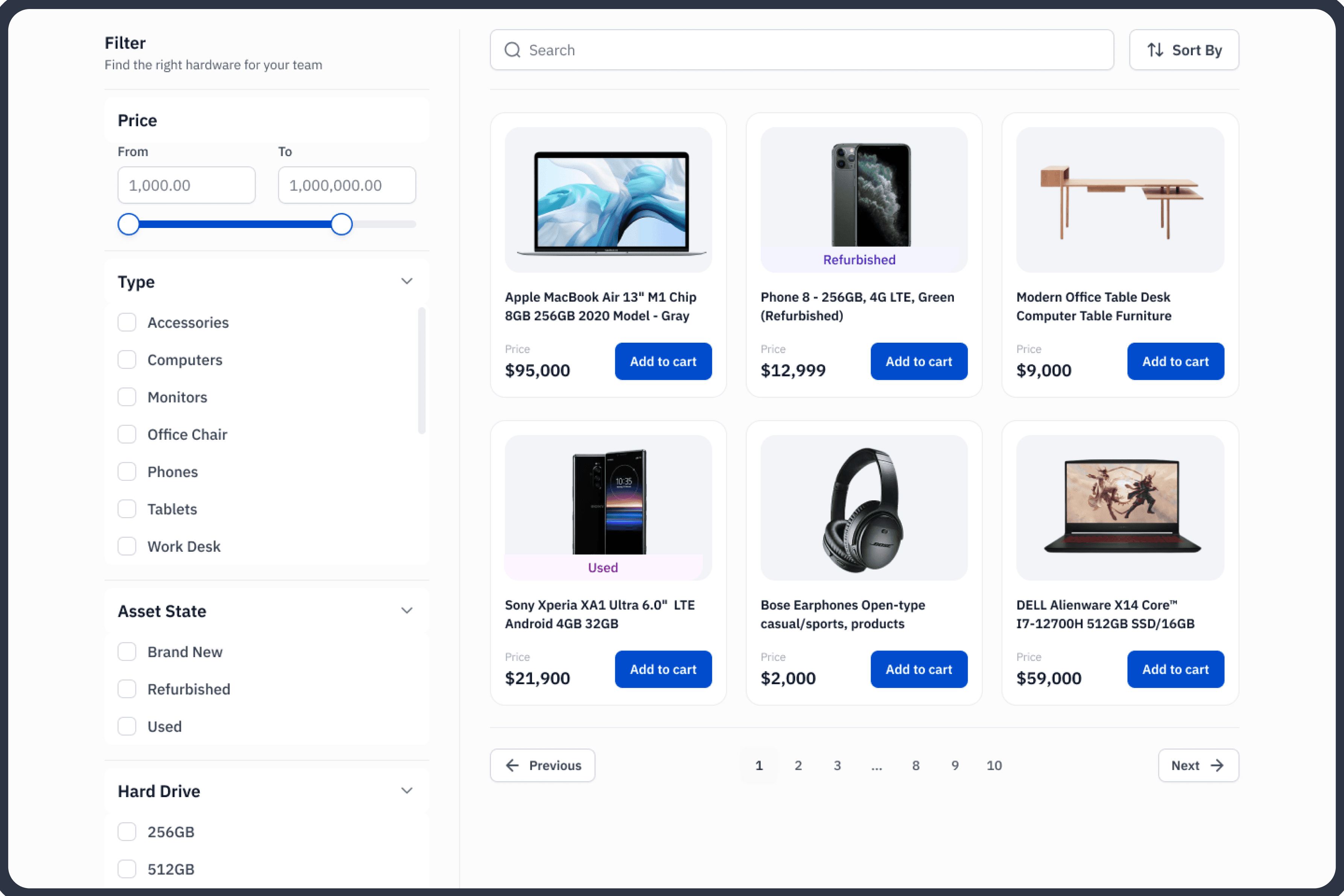 Devices: Laptops, Monitors, IT Peripherals: Monitors, Keyboards,Furniture: Work table, Egronomic chairs, Accessories: Chargers, headphones